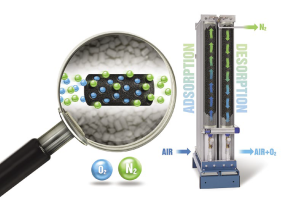 For producing nitrogen, PSA (Pressure Swing Adsorption) technology is utilized. The PSA system consists of two beds of CMS (Carbon Molecular Sieve), alternatively pressurized and depressurized. Each bed can consist of one or more columns.Compressed air, which has been pre-treated to eliminate dust and humidity, enters the base of the first active bed and flows through the CMS. Oxygen, carbon dioxide and other polluting substances in the air are trapped, but the nitrogen moves through the bed and exits at the top of the column towards a storage tank. After a certain time has elapsed, the by-now-saturated active bed is depressurized to be regenerated, while the cycle resumes symmetrically on the second bed.In order to provide our customers with top of the line solutions and innovation, we have further improved the PSA technology, designing and registering the exclusive FAST PURITY® international patent that guarantees: